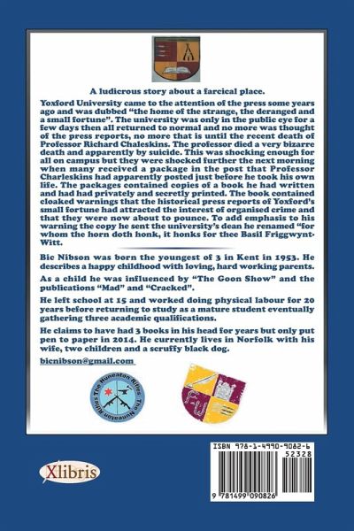 A ludicrous story about a farcical place. Yoxford University came to the attention of the press some years ago and was dubbed "the home of the strange, the deranged and a small fortune". The university was only in the public eye for a few days then all returned to normal and no more was thought of the press reports, no more that is until the recent death of Professor Richard Chaleskins. The professor died a very bizarre death and apparently by suicide. This was shocking enough for all on campus but they were shocked further the next morning when many received a package in the post that Professor Charleskins had apparently posted just before he took his own life. The packages contained copies of a book he had written and had had privately and secretly printed. The book contained cloaked warnings that the historical press reports of Yoxford’s small fortune had attracted the interest of organised crime and that they were now about to pounce. To add emphasis to his warning the copy he sent the university’s dean he renamed "for whom the horn doth honk, it honks for thee Basil Friggwynt-Witt.