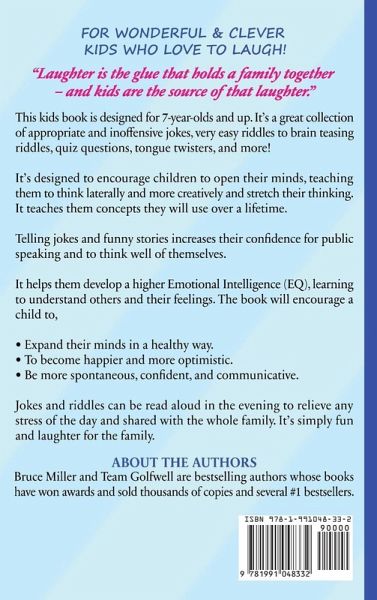 "Laughter is the glue that holds a family together - and kids are the source of that laughter." This kid's book is designed for 7-year-olds and up. It's a wonderful collection of appropriate and inoffensive jokes that range from very easy riddles to challenging brain-teasing riddles. It also features simple to complex quiz questions, tongue twisters, and more that the whole family will enjoy! All are fun and it's the perfect Holiday gift for any child who loves to make others laugh. The book is designed to encourage children to open their minds, teaching them to think laterally and more creatively and stretch their thinking that they can use over a lifetime. Telling jokes and funny stories increases their confidence in public speaking and to think well of themselves. It helps them develop a higher Emotional Intelligence (EQ), learning to understand others and their feelings. The book encourages a child to,Expand their minds in a healthy way. To become happier and more optimistic. Be more spontaneous, confident, and communicative. "The most priceless moments in life are the ones spent laughing with your children." Jokes and riddles can be read aloud in the evening to relieve any stress of the day and shared with the whole family to solve. It's simply fun and laughter for the family! Get it now! Tags: children's joke books, difficult riddles, smart kids, clever kids, joke books, dad jokes, kids jokes, jokes kids book, jokes children's books, children's humor, children's humour.