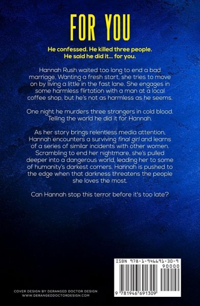 A gripping, fast-paced thriller for fans of Harlan Coben, Rachel Abbott, James Patterson, and Karin Slaughter. He confessed to killing three people. He said he did it... for you. Hannah Rush waited too long to end a bad marriage. Wanting a fresh start, she tries to move on by living a little in the fast lane. She engages in some harmless flirtation with a man at a local coffee shop, but he's not as harmless as he seems. One night he murders three strangers in cold blood. Telling the world he did it for Hannah. As her story brings relentless media attention, Hannah encounters a surviving final girl and learns of a series of similar incidents with other women. Scrambling to end her nightmare, she's pulled deeper into a dangerous world, leading her to some of humanity's darkest corners. Hannah is pushed to the edge when that darkness threatens the people she loves the most. Can Hannah stop this terror before it's too late? For You is a page-turning thriller packed with twists and pulse-pounding suspense from the best-selling author of Someone Savage.