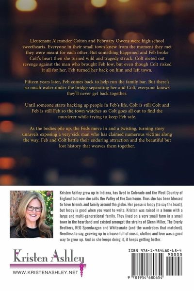 Lieutenant Alexander Colton and February Owens were high school sweethearts. Everyone in their small town knew from the moment they met they were meant for each other. But something happened and Feb broke Colt's heart then she turned wild and tragedy struck. Colt meted out revenge against the man who brought Feb low, but even though Colt risked it all for her, Feb turned her back on him and left town. Fifteen years later, Feb comes back to help run the family bar. But there's so much water under the bridge separating her and Colt, everyone knows they'll never get back together. Until someone starts hacking up people in Feb's life. Colt is still Colt and Feb is still Feb so the town watches as Colt goes all out to find the murderer while trying to keep Feb safe. As the bodies pile up, the Feds move in and a twisting, turning story unravels exposing a very sick man who has claimed numerous victims along the way, Feb and Colt battle their enduring attraction and the beautiful but lost history that weaves them together.
