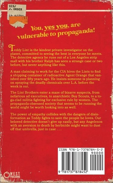 Teddy Lint is the kindest private investigator on the planet, committed to seeing the best in everyone he meets. The detective agency he runs out of a Los Angeles strip mall with his brother Ralph has seen a strange case or two before, but never anything like this. A man claiming to work for the CIA hires the Lints to find a shipping container of radioactive Agent Orange that vanished over fifty years ago. He insists someone is planning on using an army of drones to drench L.A. with the deadly chemicals before the week is out. The Lint Brothers enter a maze of bizarre suspects, from nefarious ad executives, to anarchistic Boy Scouts, to a toga-clad militia fighting for exclusive rule by women. The propaganda-obsessed society that seems to be running the world is probably worth looking into as well. The power of empathy collides with the dangers of disinformation as Teddy fights to save the people he loves. Our beloved detective doesn't give up easily, but any Angelenos with an aversion to death by herbicide might want to dust off that umbrella, just in case . . .