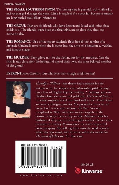 THE SMALL SOUTHERN TOWN. The atmosphere is peaceful, quiet, friendly, and unchanged through the years. Little is required for a scandal, but past scandals are long buried and seldom referred to. THE GROUP. They are six friends who have known and loved each other since childhood. The friends, three boys and three girls, are so close they shut out everyone else. THE ROMANCE. One of the group suddenly finds herself the heroine of a fantastic Cinderella story when she is swept into the arms of a handsome, wealthy, and famous singer. THE MURDER. They grieve not for the victim, but for the murderer. Can the friends stay close after the betrayal of one of their own, the most beloved member of the group? EVERYONE loves Caroline. But who loves her enough to kill for her?