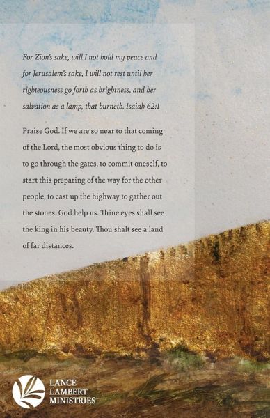 For Zion's sake, will I not hold my peace and for Jerusalem's sake, I will not rest until her righteousness go forth as brightness, and her salvation as a lamp, that burneth. Isaiah 62:1 Praise God. If we are so near to that coming of the Lord, the most obvious thing to do is to go through the gates, to commit oneself, to start this preparing of the way for the other people, to cast up the highway to gather out the stones. God help us. Thine eyes shall see the king in his beauty. Thou shalt see a land of far distances.