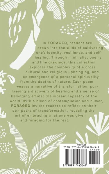 In Foraged, readers are drawn into the wilds of cultivating one's identity, resilience, and self-healing. Through minimalist poems and line drawings, this collection explores the complexity of a cross cultural and religious upbringing, and an emergence of a personal spirituality from the depths of nature and self. Each poem weaves a narrative of transformation, portraying a discovery of healing and a sense of belonging amidst the vibrant tapestry of the world. With a blend of contemplation and humor, Foraged invites readers to reflect on their own paths of transformation, revealing the art of embracing what one was given and foraging for the rest.