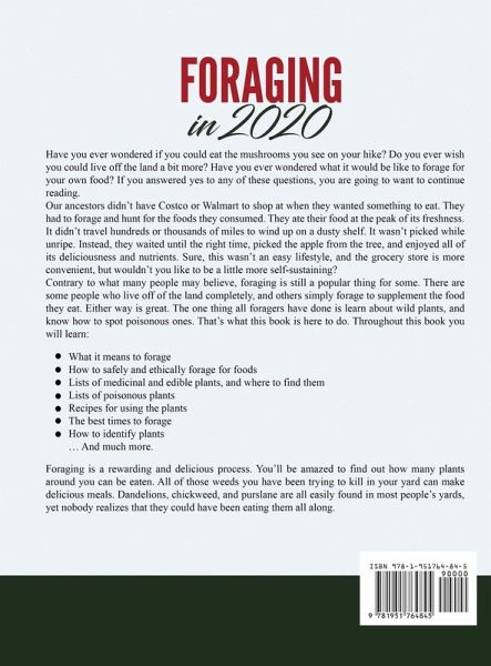 Have you ever wondered if you could eat the mushrooms you see on your hike? Do you ever wish you could live off the land a bit more? Have you ever wondered what it would be like to forage for your own food? If you answered yes to any of these questions, you are going to want to continue reading. Our ancestors didn't have Costco or Walmart to shop at when they wanted something to eat. They had to forage and hunt for the foods they consumed. They ate their food at the peak of its freshness. It didn't travel hundreds or thousands of miles to wind up on a dusty shelf. Sure, this wasn't an easy lifestyle, and the grocery store is more convenient, but wouldn't you like to be a little more self-sustaining? Contrary to what many people may believe, foraging is still a popular thing for some. There are some people who live off of the land completely, and others simply forage to supplement the food they eat. Either way is great. The one thing all foragers have done is learn about wild plants and know how to spot poisonous ones. That's what this book is here to do. Throughout this book you will learn: ¿What it means to forage ¿How to safely and ethically forage for foods ¿Lists of medicinal and edible plants, and where to find them ¿Lists of poisonous plants ¿Recipes for using the plants ¿The best times to forage ¿How to identify plants ... And much more. Foraging is a rewarding and delicious process. You'll be amazed to find out how many plants around you can be eaten. All of those weeds you have been trying to kill in your yard can make delicious meals. Dandelions, chickweed, and purslane are all easily found in most people's yards, yet nobody realizes that they could have been eating them all along. If you are serious about improving your health and living a more sustaining life, then SCROLL UP AND CLICK "ADD TO CART".