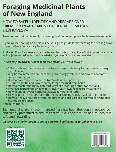 That is a Color book.¿Treat common ailments easily by turning local herbs into powerful homemade remedies. There seems to be no end to the skyrocketing costs of healthcare. It's also widely accepted that many conventional medicines have negative side effects. Consequently, it's becoming a struggle to maintain good health and avoid or treat even the simplest of ailments. Wouldn't it be great if you could get rid of insomnia without getting hooked on expensive pills? Wouldn't it feel empowering if you could reduce anxiety without resorting to pharmaceuticals? Wouldn't it be so convenient if you could simply reach into your cupboard and have something natural to treat everyday complaints? The good news is that all of these and more are possible through simple plant-based therapies. The use of herbal remedies dates back thousands of years. And due to their effectiveness and lower costs, they have re-emerged in recent years as sensible options for maintaining health and combating illness. And now, here is a guide to the natural way of healing that's comprehensive, clear, and engaging. If you live in New England, this will be your go-to guide for harnessing the healing power of plants that can be easily found in your area. And even if you're already an experienced herbalist, this guide will still prove invaluable as it is jam-packed with practical wisdom you won't find anywhere else. In "Foraging Medicinal Plants of New England" you will discover:100+ medicinal plants in your local area presented clearly for accurate and easy identification Why herbal remedies are becoming increasingly valued, and how to become a competent herbalist How to collect and store herbs to maintain their potency 15 important tips on how to safely forage for medicinal herbs How to master the many different ways of preparing herbal concoctions Practical instructions on how to cultivate your own healing herbs at home How to support your herbalist lifestyle for the long-term Easy-to-prepare recipes for herbal remedies using readily available ingredients How to finally break free from the burden and risks associated with conventional healthcare products And much more. Not all therapeutic herbs have the same or equal properties, so using them can become a challenge. For instance, an ingredient for a soothing balm for you might turn out to be an allergen for someone else. This is a serious consideration, especially if you're sharing herbal preparations with your family and friends. Therefore, it's important to be responsible and knowledgeable about every single plant you handle, which is why you need a resource that's based only on proven principles of herbal medicine. Each medicinal plant recommended here has been thoroughly researched and clearly presented to ensure that your journey through natural health is safe and rewarding.If you're eager to discover and make the most outof powerful healing herbs found in your area,then scroll up and click the "Add to Cart" button now.