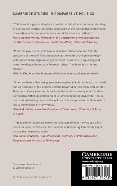 Why do governments tolerate the violation of their own laws and regulations? Conventional wisdom is that governments cannot enforce their laws. Forbearance as Redistribution challenges the standard interpretation by showing that politicians choose not to enforce laws to distribute resources and win elections. Alisha Holland demonstrates that this forbearance towards activities such as squatting and street vending is a powerful strategy for attracting the electoral support of poor voters. In many developing countries, state social programs are small or poorly targeted and thus do not offer politicians an effective means to mobilize the poor. In contrast, forbearance constitutes an informal welfare policy around which Holland argues much of urban politics turns. While forbearance offers social support to those failed by their governments, it also perpetuates the same exclusionary welfare policies from which it grows.