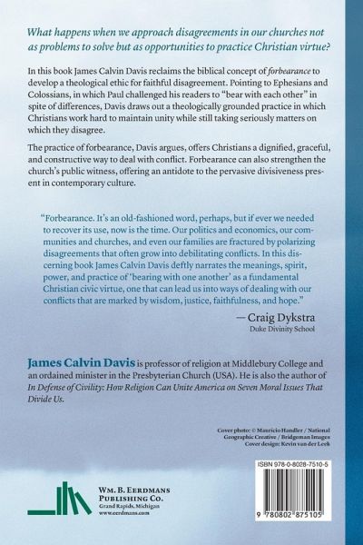 Offers a faithful, constructive way to deal with dissent What happens when we approach disagreement not as a problem to solve but as an opportunity to practice Christian virtue? In this book James Calvin Davis reclaims the biblical concept of forbearance to develop a theological ethic for faithful disagreement. Pointing to Ephesians and Colossians, in which Paul challenged his readers to "bear with each other" in spite of differences, Davis draws out a theologically grounded practice in which Christians work hard to maintain unity while still taking seriously matters on which they disagree. The practice of forbearance, Davis argues, offers Christians a dignified, graceful, and constructive way to deal with conflict. Forbearance can also strengthen the church's public witness, offering an antidote to the pervasive divisiveness present in contemporary culture.