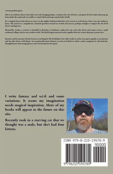 A most perilous quest. This is no ordinary desert, but rather one with changing shapes, scorpions the size of horses, and giant 36-foot snakes that pop up from under the sands and can swallow a camel whole and snap a man's body in half. It's a magical desert that shows no mercy to the mighty barbarian Braeden as he crosses it on his horse, Finn--not your ordinary horse. The warrior is a magnificent, muscled specimen weaned on swords and sorcery, perhaps enough to conquer the she-devil desert--perhaps not. Meanwhile, Azalea, a warrior as beautiful as Braeden is handsome, makes her way across the desert and comes across a small enchanted village with its own resident witch. The Red Dragon tattooed on her signifies that she is more than just a pretty face. Braeden and his sarcastic friend, Zack are searching for The Forbidden City while Azalea is on her own quest equally as treacherous and she rides alone--well almost. An exceptionally smart Siamese cat tries to lead her to safety; surely a magical cat, who leads her through bizarre and strange places as the warrior pursues her quest.