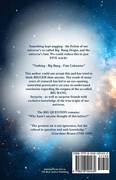 Something kept nagging - the fiction of our universe's so-called Big Bang Origin, and the universe's fate. We could reduce this to just FIVE words: "Nothing - Big Bang - Fate Unknown" This author could not accept this and has tried to think BIGGER than anyone. The result of many years of research has led to an eye-opening, somewhat provocative yet easy-to-understand conclusion regarding the enigma of the so-called BIG BANG. Surprise - as well as surprise friends with exclusive knowledge of the true origin of our universe. The BIG QUESTION remains: "Why hasn't anyone thought of this before?"