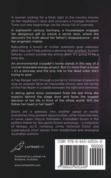 A woman looking for a fresh start in the country knocks on her neighbour's door and uncovers a hostage situation. Turns out new beginnings can be chock-full of surprises. In eighteenth century Germany, a housekeeper engages her dangerous gift to unlock a secret door, where she discovers the truth about her father's disappearance – and her enigmatic master. Babysitting a bunch of civilian scientists goes sideways after they can't help poking a glowing alien artefact. System failures. Locked outside the airlock door. It's going to be a long day. An environmental crusader's home stands in the way of a crucial renewable energy project. But it's more than a house – it's a doorway and the only link to the dead sister she's trying to save. A Fae Ranger sent through a portal to Victorian England to stop an assassin faces an impossible choice: save her family or the Fae Realm in a battle between the light and darkness. A dating game show contestant finds the last thing she expects behind the stage door and faces the biggest decision of her life, in front of the whole world. Will she follow her head or her heart? Doors are a gateway into another space or world. Sometimes they present opportunities, other times barriers, in some cases they're forbidden. Forbidden Doors is the perfect theme for this genre fiction anthology – a collection of fantasy, sci-fi, romance, crime, historical fiction and supernatural short stories from established and emerging Australian authors.