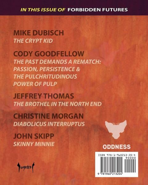 For Forbidden Futures Magazine, our premiere issue offers a truly ghoulish and cosmic horror experience. Readers can delve into a full-length Crypt Kid graphic adventure by MIKE DUBISCH. Meanwhile, JOHN SKIPP's Skinny Minnie explores the beastly hunger of the undead, while CHRISTINE MORGAN's Diabolicus Interruptus witnesses an infernal orgy of unspeakable depravity. JEFFREY THOMAS takes readers on a terrifying hoedown at The Brothel In The North End, where the line between pleasure and pain becomes blurred. And for an editorial that will chill the bones, The Past Demands A Rematch by CODY GOODFELLOW.