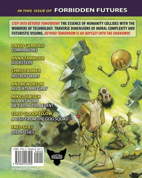 Step into Beyond Tomorrow with Forbidden Futures 10! The essence of humanity collides with the wonders of technology. Traverse dimensions of moral complexity and futuristic visions. Beyond Tomorrow is an odyssey into the unknown! David Gerrold's Companions grapples with the intriguing question of how parents nurture their progeny in a world devoid of traditional teachers. Andre Norton's enigmatic tale, All Cats Are Grey, unfurls a mesmerizing saga involving a mysterious black cat, an elusive, invisible entity, and the allure of hidden treasures. Prepare to be swept away by the uncanny and the unforeseen. Cody Goodfellow's A Visit From The God Squad is a cautionary tale of how life leeches off the grand plan. Fred Golt's Dispatches recounts the perils of space exploration on the edges of the galaxy. Chris Farmer's Hotrod Wars explores a distant future where battling robots determine your fate. Anna Tambour's Lucksters introduces you to a world where evolved beings confront the echoes of ancient technologies, unveiling a tapestry of suspense and luck. Mike Dubisch's De-extinction Event (16-page comic) propels you into a future where scientists try to resurrect the human race.