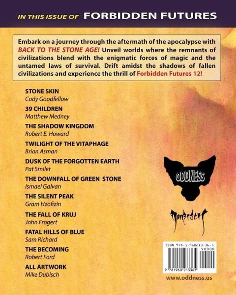 Embark on a journey through the mysterious aftermath of the apocalypse with "Forbidden Futures 12: Back to the Stone Age." This anthology unveils worlds where the remnants of civilizations blend with the enigmatic forces of magic and the untamed laws of survival. Journey amidst the shadows of fallen civilizations, through landscapes shrouded in mystery, and experience the thrill of Back to the Stone Age. Experience the first minutes of the end in Robert Ford's The Becoming on the eve of the apocalypse. Join a tribal odyssey in Gram Hzofizin's The Silent Peak, where celestial omens guide destiny. Navigate the desolate realms of Brian Asman's Twilight of the Vitaphage, a dramatic quest in an evil landscape. Explore the intricacies of time realities in Matthew Medney's 39 Children, which pushes the limits of human endurance and temporal boundaries. Discover future troglodytes in Pat Smilet's Dusk of the Forgotten Earth, the last survivors of a DNA War. Enter the mystical, shadowy world of John Frogert's The Fall of Kruj. Witness the tumultuous aftermath of war generations later in Ismael Galvan's The Downfall of Green Stone. Brave the mystical Fatal Hills of Blue by Sam Richard is a tale of survival against enigmatic forces. Venture into Cody Goodfellow's Stone Skin, a brutal tale of survival. Get lost in Robert E. Howard's The Shadow Kingdom, a timeless exploration of ancient civilizations. Take an extraordinary journey back to a time when magic and mystery reigned supreme.
