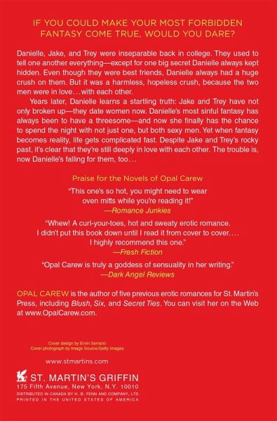 If you could make your most forbidden fantasy come true, would you dare? Danielle, Jake and Trey were inseparable back in college. They used to tell each other everything-except for one big secret Danielle always kept hidden. That even though they were best friends, Danielle always had a huge crush on them. But it was a harmless, hopeless crush, because the two men were in love...with each other. Years later, Danielle learns a startling truth. Jake and Trey have not only broken up-- they date women now. Danielle's most sinful fantasy has always been to have a threesome-and now she finally has the chance to spend the night with not just one, but with both sexy men. Yet when erotic fantasy becomes reality, life gets complicated fast. Despite Jake and Trey's rocky past, it's clear to Danielle that they're still deeply in love with each other. The trouble is, now Danielle's falling for them too... "Overstocked with scorching-hot sex scenes of every sort." - RT Book Reviews