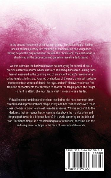 In the second instalment of the Iwizadi trilogy, "Forbidden Magic," Aisling faces a perilous journey into the heart of manipulation and vengeance. Having helped the displaced Khun reclaim their homeland, the celebration is short-lived as the once-promised paradise reveals a dark secret. As war looms on the horizon between nations vying for control of Noi, a precious natural resource whose uses are still being discovered. Aisling finds herself ensnared in the cunning web of an ancient wizard's revenge for a crime long lost to history. Haunted by shadows of the past, she must navigate the treacherous waters of deceit, betrayal, and self-discovery to break free from the enchantments that threaten to shatter the fragile peace she fought so hard to attain. She must learn what it means to be a leader. With alliances crumbling and tensions escalating, she must summon inner strength and improve both her magic ability and her relationships with those closest to her in order to unravel Iwizadi's schemes. Will she succumb to the darkness that surrounds her, or can she rise above the manipulation and forge a path towards a brighter future? In a world teetering on the brink of war, "Forbidden Magic" is a mesmerizing tale of resilience, sacrifice, and the enduring power of hope in the face of insurmountable odds.