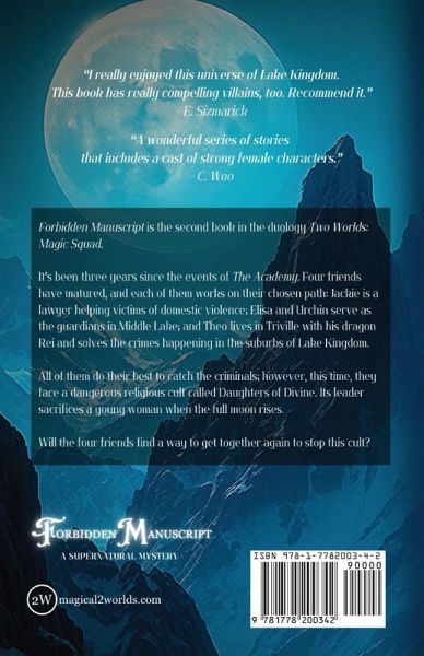 Forbidden Manuscript is the second book in duology Two Worlds: Magic Squad. It's been three years since the events of The Academy. Four friends have matured, and each of them works on their chosen path: Jackie is a lawyer helping victims of domestic violence; Elisa and Urchin serve as the guardians in the capital; and Theo lives in Triville with his dragon Rei and solves the crimes happening in the suburbs of Lake Kingdom. ¿All of them do their best catching the criminals, however this time they face a dangerous religious cult called Daughters of Divine. Its leader sacrifices a young woman when the full moon rises. ¿Will four friends find a way to get together again to stop this cult?
