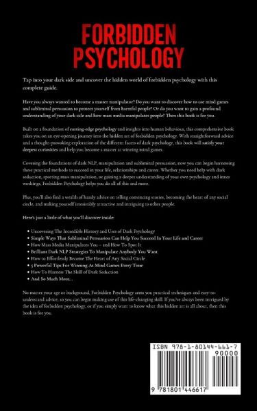 Tap into your dark side and uncover the hidden world of forbidden psychology with this complete guide. Have you always wanted to become a master manipulator? Do you want to discover how to use mind games and subliminal persuasion to protect yourself from harmful people? Or do you want to gain a profound understanding of your dark side and how mass media manipulates people? Then this book is for you. Built on a foundation of cutting-edge psychology and insights into human behaviour, this comprehensive book takes you on an eye-opening journey into the hidden art of forbidden psychology. With straightforward advice and a thought-provoking exploration of the different facets of dark psychology, this book will satisfy your deepest curiosities and help you become a master at winning mind games. Covering the foundations of dark NLP, manipulation and subliminal persuasion, now you can begin harnessing these practical methods to succeed in your life, relationships and career. Whether you need help with dark seduction, spotting mass manipulation, or gaining a deeper understanding of your own psychology and inner workings, Forbidden Psychology helps you do all of this and more. Plus, you'll also find a wealth of handy advice on telling convincing stories, becoming the heart of any social circle, and making yourself irresistibly attractive and intriguing to other people. Here's just a little of what you'll discover inside: Uncovering The Incredible History and Uses of Dark Psychology Simple Ways That Subliminal Persuasion Can Help You Succeed In Your Life and Career How Mass Media Manipulates You - and How To Spot It Brilliant Dark NLP Strategies To Manipulate Anybody You Want How to Effortlessly Become The Heart of Any Social Circle 5 Powerful Tips For Winning At Mind Games Every Time How To Harness The Skill of Dark Seduction And So Much More... No matter your age or background, Forbidden Psychology arms you practical techniques and easy-to-understand advice, so you can begin making use of this life-changing skill. If you've always been intrigued by the idea of forbidden psychology, or if you simply want to know what this hidden art is all about, then this book is for you.