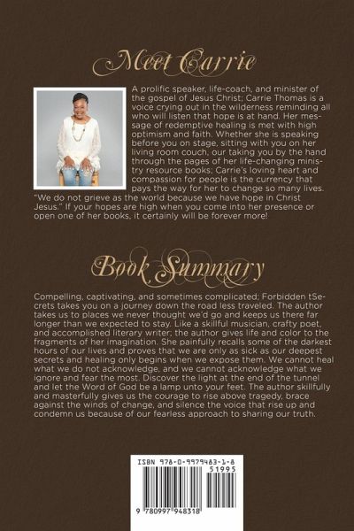 Compelling, captivating, and sometimes complicated; Forbidden Secrets takes you on a journey down the road less traveled. The author takes us to places we never thought we'd go and keeps us there far longer than we expected to stay.