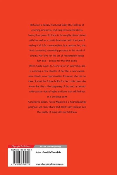 Between a deeply fractured family life, feelings of crushing loneliness, and long-term mental illness, twenty-four-year-old Carla is thoroughly disenchanted with life, and as a result, fascinated with the idea of ending it all. Life is meaningless, but despite this, she finds something resembling purpose in the world of cinema. Her love for the art of moviemaking keeps her alive - at least for the time being. When Carla moves to Geneva for an internship, she is entering a new chapter of her life: a new career, new friends, new opportunities. However, she has no idea of what the future holds for her. Little does she know that this is the beginning of the end: a twisted rollercoaster ride of highs and lows that will find her at a breaking point. A masterful debut, Force Majeure is a heartbreakingly poignant, yet razor-sharp and darkly witty glimpse into the reality of living with mental illness.