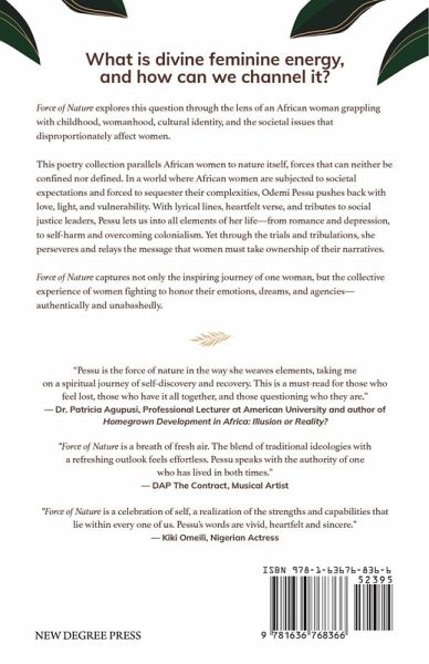 What is divine feminine energy, and how can we channel it? Force of Nature explores this question through the lens of an African woman grappling with childhood, womanhood, cultural identity, and the societal issues that disproportionately affect women. This poetry collection parallels African women to nature itself, forces that can neither be confined nor defined. In a world where African women are subjected to societal expectations and forced to sequester their complexities, Odemi Pessu pushes back with love, light, and vulnerability. With lyrical lines, heartfelt verse, and tributes to social justice leaders, Pessu lets us into all elements of her life-from romance and depression, to self-harm and overcoming colonialism. Yet through the trials and tribulations, she perseveres and relays the message that women must take ownership of their narratives. Force of Nature captures not only the inspiring journey of one woman, but the collective experience of women fighting to honor their emotions, dreams, and agencies-authentically and unabashedly.