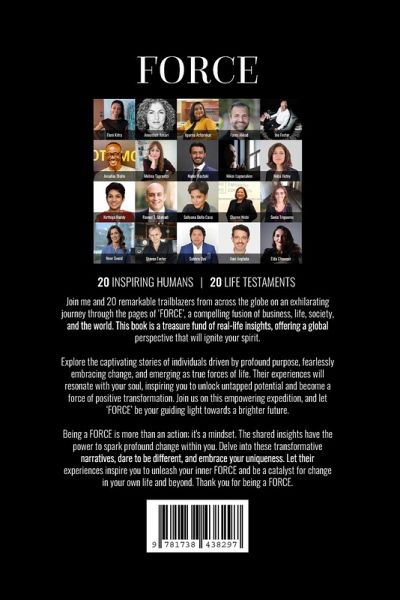 Join Eleni Kitra and 20 remarkable trailblazers from companies such as Meta, GM, Xprize, Kellogg's and Reebok as they tell real-life stories in 'Force'. 'Force' is a treasure trove of personal insights on business, life, society and the contemporary world, offering a global perspective that will ignite your spirit. Explore the captivating stories of individuals driven by profound purpose, fearlessly embracing change, and emerging as true forces of life. Their experiences will resonate with your soul, inspiring you to unlock untapped potential and become a force of positive transformation. Join us on this empowering expedition, and let 'FORCE' be your guiding light towards a brighter future. Being a 'FORCE' is more than an action, it's a mindset. The shared insights have the power to spark profound change within you. Delve into these transformative narratives, dare to be different, and embrace your uniqueness. Let their experiences inspire you to unleash your inner 'FORCE' and be a catalyst for change in your own life and beyond. Thank you for being a 'FORCE'. Co-authors: Amadou Diallo, Anousheh Ansari, Aparna Acharekar, Fares Akad, Joe Foster, Kirthiga Reddy, Melina Taprantzi, Nader Al Bastaki, Nikos Lagousakos, Noha Hefny, Noor Sweid, Ramez Shehadi, Sallyann Della Casa, Sharon Nishi, Sonia Trigueros, Steven Foster, Subhra Das, Xavi Anglada. Foreword from Elda Choucair.