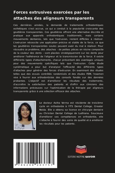 Ces dernières années, la demande de traitements orthodontiques esthétiques s'est accrue, ce qui a conduit à la popularité croissante des gouttières transparentes. Ces gouttières offrent une alternative discrète et pratique aux appareils orthodontiques traditionnels, mais certains mouvements dentaires, tels que l'extrusion, restent difficiles à réaliser. L'extrusion nécessite une application précise et stable de la force, ce que les gouttières transparentes seules peuvent avoir du mal à réaliser. Pour résoudre ce problème, des attaches - de petites pièces en résine composite de la couleur des dents - sont placées stratégiquement sur les dents pour améliorer l'adhérence de l'aligneur et la transmission de la force. Il existe différents types d'attachements, chacun présentant des avantages uniques pour des mouvements spécifiques tels que l'extrusion. Cette étude systématique a pour but d'analyser l'efficacité des différents types d'attaches pour générer des forces d'extrusion. En examinant des études telles que des essais contrôlés randomisés et des études FEM, l'examen vise à fournir aux orthodontistes des conseils fondés sur des données probantes. L'objectif est d'améliorer les résultats des traitements, d'accroître la satisfaction des patients et d'offrir aux cliniciens des informations précieuses sur l'optimisation de la thérapie par aligneurs transparents grâce à une sélection efficace des attaches.