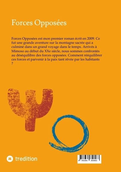 Forces Opposées est mon premier roman écrit en 2009. Ce fut une grande aventure sur la montagne sacrée qui a culminé dans un grand voyage dans le temps. Arrivés à Mimoso au début du XXe siècle, nous sommes confrontés au déséqui-libre des forces opposées. Comment rééquilibrer ces forces et parvenir à la paix tant rêvée par les habitants ?