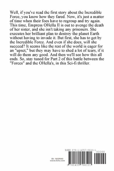 Well, if you've read "Part One" of the Incredible Force, you know how they fared. Now, it's just a matter of time when their foes have to regroup and try again. This time, Empress O'Hella II is out to avenge the death of her sister, and she isn't taking any prisoners. She executes her brilliant plan to destroy the planet Earth without having to invade it. But first, she has to get by the Incredible Force. And even if she does, will she succeed? It seems like the rest of the world is eager for an "upset," but they may have to shed some tears, if it'll do them any good. And then we'll see how this all ends. So, stay tuned for Part 2 of this battle between the "Forces" and the O'Hella's, in this Sci-fi thriller.