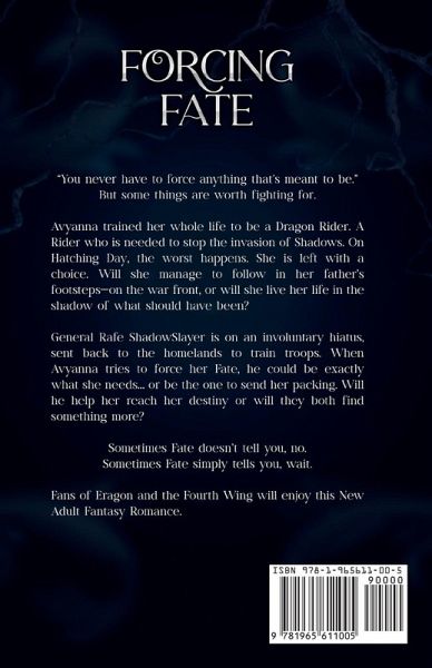 Perfect for lovers of Fourth Wing and Eragon, this slow-burn, enemies-to-lovers fantasy romance will keep you on the edge of your seat! "You never have to force anything that's meant to be." But some things are worth fighting for. Avyanna trained her whole life to be a Dragon Rider. A Rider who is needed to stop the invasion of Shadows. On Hatching Day, the worst happens. She is left with a choice. Will she manage to follow in her father's footsteps-on the war front, or will she live her life in the shadow of what should have been? General Rafe ShadowSlayer is on an involuntary hiatus, sent back to the homelands to train troops. When Avyanna tries to force her Fate, he could be exactly what she needs... or be the one to send her packing. Will he help her reach her destiny or will they both find something more? Sometimes Fate doesn't tell you, no. Sometimes Fate simply tells you, wait. Forcing Fate is a book that tells the story of Avyanna as she grows to be a young woman. There are dark and gritty themes and steamy scenes. Gender stereotypes are broken. Lines are crossed. Secrets are revealed. Buckle up, here there be dragons.