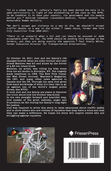 On October 18, 2011 Joel and his family's life changed forever when his older brother and best friend Mathieu was hit and killed by the driver of a 28 ton crane truck. Mathieu, an artist, was riding his bike home from his art studio in Brooklyn, NY. The tragedy made headlines on CNN, the New York Times, the Wall Street Journal, Maclean's Magazine, the CBC, and many other news agencies in Canada and the US. Through his eyes Joel gives first-hand knowledge of what it's been like to go up against one of the world's largest police forces, the NYPD. It took Joel and his family six years to discover the truth about how his brother was killed. In his own straight forward and heartfelt way, Joel speaks of the grief, sadness, anger and frustration he felt during his family's long fight for justice. Joel was inspired to write this story to raise awareness about traffic safety and to show others who are victims of injustice that they have a voice and that they can make a difference. He hopes his story will inspire others who are struggling against injustice.