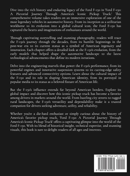 Dive into the rich history and enduring legacy of the Ford F-150 in 'Ford F-150: A Pictorial Journey Through America's Iconic Pickup Truck.' This comprehensive volume takes readers on an immersive exploration of one of the most legendary vehicles in automotive history. From its inception as a utilitarian workhorse to its evolution into a global cultural icon, the Ford F-150 has captured the hearts and imaginations of enthusiasts around the world. Through captivating storytelling and stunning photography, readers will trace the F-150's journey through the decades, from its humble beginnings in the post-war era to its current status as a symbol of American ingenuity and innovation. Each chapter offers a detailed look at the F-150's evolution, from the early models that helped shape the automotive landscape to the latest technological advancements that define its modern iterations. Delve into the engineering marvels that power the F-150's performance, from its powerful engines and innovative suspension systems to its cutting-edge safety features and advanced connectivity options. Learn about the cultural impact of the F-150 and its role in shaping American identity, from its portrayal in popular media to its status as a beloved fixture of American life. But the F-150's influence extends far beyond American borders. Explore its global impact and discover how this iconic pickup truck has become a favorite among drivers in markets around the world. From bustling city streets to rugged rural landscapes, the F-150's versatility and dependability make it a trusted companion for drivers seeking adventure, utility, and reliability. Whether you're a die-hard enthusiast or simply curious about the history of America's favorite pickup truck, 'Ford F-150: A Pictorial Journey Through America's Iconic Pickup Truck' offers a captivating glimpse into the world of the Ford F-150. With its blend of historical insight, technical expertise, and stunning visuals, this book is sure to delight readers of all ages and interests.