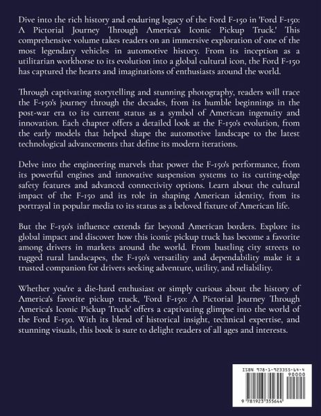 Dive into the rich history and enduring legacy of the Ford F-150 in 'Ford F-150: A Pictorial Journey Through America's Iconic Pickup Truck.' This comprehensive volume takes readers on an immersive exploration of one of the most legendary vehicles in automotive history. From its inception as a utilitarian workhorse to its evolution into a global cultural icon, the Ford F-150 has captured the hearts and imaginations of enthusiasts around the world. Through captivating storytelling and stunning photography, readers will trace the F-150's journey through the decades, from its humble beginnings in the post-war era to its current status as a symbol of American ingenuity and innovation. Each chapter offers a detailed look at the F-150's evolution, from the early models that helped shape the automotive landscape to the latest technological advancements that define its modern iterations. Delve into the engineering marvels that power the F-150's performance, from its powerful engines and innovative suspension systems to its cutting-edge safety features and advanced connectivity options. Learn about the cultural impact of the F-150 and its role in shaping American identity, from its portrayal in popular media to its status as a beloved fixture of American life. But the F-150's influence extends far beyond American borders. Explore its global impact and discover how this iconic pickup truck has become a favorite among drivers in markets around the world. From bustling city streets to rugged rural landscapes, the F-150's versatility and dependability make it a trusted companion for drivers seeking adventure, utility, and reliability. Whether you're a die-hard enthusiast or simply curious about the history of America's favorite pickup truck, 'Ford F-150: A Pictorial Journey Through America's Iconic Pickup Truck' offers a captivating glimpse into the world of the Ford F-150. With its blend of historical insight, technical expertise, and stunning visuals, this book is sure to delight readers of all ages and interests.