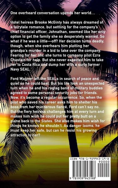 One overheard conversation upends her world... Hotel heiress Brooke McGinty has always dreamed of a fairytale romance, but settling for the company's chief financial officer, Johnathan, seemed like her only option to get the family she so desperately wanted. So what if he was a little-off? Her decision turns deadly, though, when she overhears him plotting her grandpa's murder in a bid to take over the company. Fearing for her life, she turns to company pilot Ezra Chastain for help. But she never expected him to take her to Costa Rica and dump her with a surly former Navy SEAL. Ford Wagner left the SEALs in search of peace and quiet so he could heal. But his life took an unexpected turn when he and his ragtag band of military buddies agreed to some personal security jobs for friends. Now, it's become a regular occurrence. So, when the pilot who saved his career asks him to shelter his boss from her murderous fiancé, Ford can't say no. But the fiery heiress challenges him at every turn and makes him wish he could put her pretty butt on a plane back to the States. She also makes him wish for things he knows he shouldn't. As danger looms, he must keep her safe, but can he resist his growing attraction to her?
