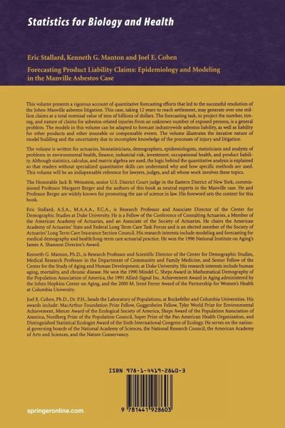 "Demographers Eric Stallard, Kenneth Manton and Joel Cohen use a risk assessment framework to estimate the numbers of claims expected during the period between 1990 and 2049 for asbestos-related disease among men exposed to ... asbestos products. ... Forecasting Product Liability Claims is notable for its illustration of the possibility of using epidemiologic and demographic methods to develop models for broad policy purposes. ... It is formula-rich and dense in its description of data sources and the machinery of the models, as it should be." (Jonathan M. Samet, Science-AAAS, May, 2006)