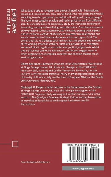 Introduction: The Challenges of Prevention; C.De Franco & C.O.Meyer PART I: FORECASTING HARM The Coastline of The Future: Some Limits on Forecasting and Prediction; D.Omand Epistemology of Forecasting in International Relations: Knowing the Difference between 'Intelligence Failure' and 'Warning Failure'; J.Goldman Foresec: Lessons Learnt from a Pan-European Security Foresight Project; V.Brummer , C.Burnley, H.Carlsen, A.Duta, B.Giegerich & R.Magoni Modelling Transnational Environmental Risks: Scenarios for Decision Support; F.Wagner Risk, Uncertainty and the Assessment of Organised Crime; T.Van Der Beken PART II: COMMUNICATING AND LEARNING FROM WARNINGS Mediatised Warnings: Late, Wrong, Yet Indispensable? Lessons from Climate Change and Civil War; C.De Franco & C.O.Meyer Do They Listen? Communicating Warnings: An Intelligence Practitioners Perspective; W.Shapcott Responding to early flood warnings in the European Union; D.Demeritt & S.Nobert Dark Secrets: Face-Work, Organizational Culture and Disaster Prevention; M.S.Gerstein & E.H.Schein PART III: RESPONDING TO WARNINGS Transnational Risk Management: A Business Perspective; C.Crossin & J.Smither From the 'Neurotic' to the 'Rationalising' State: Risk and the Limits of Governance; H.Rothstein, O.Borraz & M.Huber Ilos and Silences: The Role of Fragmentation in the Recent Financial Crisis; G.Tett Forecasting, Warning and Preventive Policy: The Case of Finance; T.F.Huertas Prospective Sense-Making: A Realistic Approach to 'Foresight for Prevention' in an Age of Complex Threats; W.H.Fishbein Conclusion: New Perspectives for Theorising and Addressing Transnational Risks; C.O.Meyer & C.De Franco