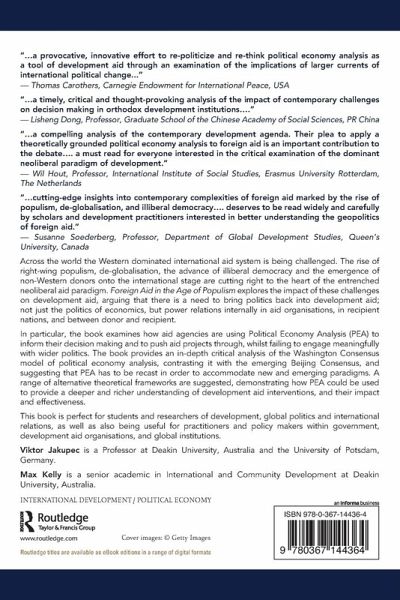 Across the world the Western dominated international aid system is being challenged. The rise of right-wing populism, de-globalisation, the advance of illiberal democracy and the emergence of non-Western donors onto the international stage are cutting right to the heart of the entrenched neoliberal aid paradigm. Foreign Aid in the Age of Populism explores the impact of these challenges on development aid, arguing that there is a need to bring politics back into development aid; not just the politics of economics, but power relations internally in aid organisations, in recipient nations, and between donor and recipient. In particular, the book examines how aid agencies are using Political Economy Analysis (PEA) to inform their decision making and to push aid projects through, whilst failing to engage meaningfully with wider politics. The book provides an in-depth critical analysis of the Washington Consensus model of political economy analysis, contrasting it with the emerging Beijing Consensus, and suggesting that PEA has to be recast in order to accommodate new and emerging paradigms. A range of alternative theoretical frameworks are suggested, demonstrating how PEA could be used to provide a deeper and richer understanding of development aid interventions, and their impact and effectiveness. This book is perfect for students and researchers of development, global politics and international relations, as well as also being useful for practitioners and policy makers within government, development aid organisations, and global institutions.