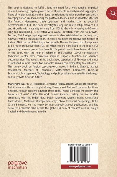 This book is designed to fulfill a long felt need for a wide ranging empirical research on foreign capital-growth nexus. It presents an analysis of disaggregated flows of foreign capital and their long run relationship with growth process in an emerging nation like India during the past four decades. The study detects factors like financial deepening, trade openness and market size, as potential determinants of FDI. The book investigates long run relationship between FDI and Growth, with causality running from FDI to Growth, whereby Aid-Growth long run relationship is detected with causal direction from Aid to Growth. Further, Net foreign capital-growth nexus is also established in the long run, however, with no causal direction. The book examines the relative significance of Aid and FDI in terms of their impact on growth. The results reveal that Aid appears to be more productive than FDI, but when export is included in the model FDI appears to be more productive than Aid. Empirical results have been calculated in the book, with the help of Johansen and Juselius (1990) co-integration technique, vector error correction, impulse response function and variance decomposition. The results in the book show, superiority of FDI over Aid is not established in India, hence two variables remain complementary to each other. This timely book on foreign capital-growth nexus in India is likely to attract researchers, teachers of Economics, Mathematics, Commerce, Business Economics, Management, Technology and policy-makers interested in the foreign capital-growth nexus in future.