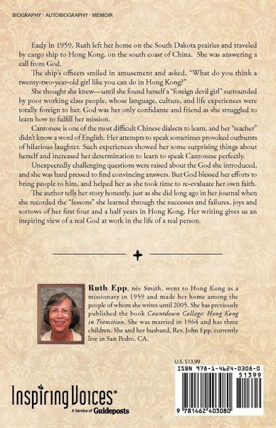 Early in 1959, Ruth left her home on the South Dakota prairies and traveled by cargo ship to Hong Kong, on the south coast of China. She was answering a call from God. The ship's officers smiled in amusement and asked, "What do you think a twenty-two-year-old girl like you can do in Hong Kong?" She thought she knew-until she found herself a "foreign devil girl" surrounded by poor working class people, whose language, culture, and life experiences were totally foreign to her. God was her only confidante and friend as she struggled to learn how to fulfill her mission. Cantonese is one of the most difficult Chinese dialects to learn, and her "teacher" didn't know a word of English. Her attempts to speak sometimes provoked outbursts of hilarious laughter. Such experiences showed her some surprising things about herself and increased her determination to learn to speak Cantonese perfectly. Unexpectedly challenging questions were raised about the God she introduced, and she was hard pressed to find convincing answers. But God blessed her efforts to bring people to him, and helped her as she took time to re-evaluate her own faith. The author tells her story honestly, just as she did long ago in her journal when she recorded the "lessons" she learned through the successes and failures, joys and sorrows of her first four and a half years in Hong Kong. Her writing gives us an inspiring view of a real God at work in the life of a real person.