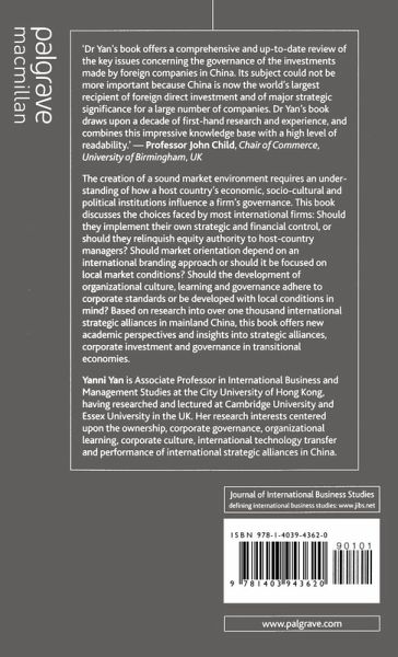 'Dr Yan's book offers a comprehensive and up-to-date review of the key issues concerning the governance of the investments made by foreign companies in China. Its subject could not be more important because China is now the world's largest recipient of foreign direct investment and of major strategic significance for a large number of companies. Dr. Yan's book draws upon a decade of firsthand research and experience,. and combines this impressive knowledge base with a high level of readability.' - Professor John Child, Chair of Commerce, University of Birmingham, UK