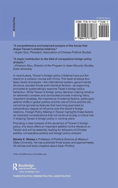 Following President Chen Sui-bian's victory in the controversial 2004 presidential election, this book examines the future direction of Taiwan's foreign policy, focusing on the internal and external forces that influence and shape the countries foreign policy decisions today. The author suggests that four levels of analysis - the international system, governmental structure, societal forces and individual factors - pose some explanatory value when seeking to understand Taipei's foreign policy behaviour. Taiwan's foreign policy decision-making remains an extremely complex process involving many important variables. However the author's detailed analysis reveals that external factors, particularly seismic shifts in global politics and the role of China and the US have had an extraordinary degree of influence over the island's foreign relations. This book highlights these factors as important considerations that continue to play a critical role in shaping Taiwan's foreign policy. Providing a clear analysis of the dynamics of Taiwan's foreign policy, Foreign Policy Making in Taiwan is an important addition to the literature on Taiwan and will be essential reading for followers of Chinese politics, comparative politics and foreign policy analysis.