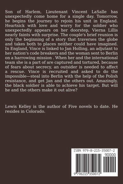 Son of Harlem, Lieutenant Vincent LaSalle has unexpectedly come home for a single day. Tomorrow he begins the journey to rejoin his unit in England. Heartsick with love and worry for the soldier who unexpectedly appears on her doorstep, Vierna Lillis nearly faints with surprise. The couple's brief reunion is only the beginning of a story that will traverse the globe and take both to places neither could have imagined. In England, Vince becomes linked to Jan Holling, an adjutant to her nation's code breakers and the woman sent to Berlin on a harrowing mission . When her and the international team she is a part of are captured and tortured, because of fears about secrecy, an outsider is needed to affect a rescue. Vince is recruited and asked to do the impossible—steal into Berlin with the help of the Polish resistance and get Jan and the others out. Amazingly, the dark soldier is able to achieve his target. But will he and the others make it out alive?