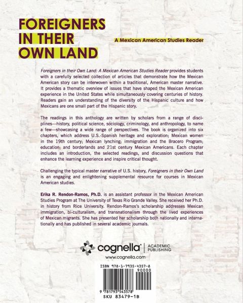 Foreigners in their Own Land: A Mexican American Studies Reader provides students with a carefully selected collection of articles that demonstrate how the Mexican American story can be interwoven within a traditional, American master narrative. It provides a thematic overview of issues that have shaped the Mexican American experience in the United States while simultaneously covering centuries of history. Readers gain an understanding of the diversity of the Hispanic culture and how Mexicans are one small part of the Hispanic story. The readings in this anthology are written by scholars from a range of disciplines-history, political science, sociology, criminology, and anthropology, to name a few-showcasing a wide range of perspectives. The book is organized into six chapters, which address U.S.-Spanish heritage and exploration; Mexican women in the 19th century; Mexican lynching; immigration and the Bracero Program; education; and borderlands and 21st century Mexican Americans. Each chapter includes an introduction, the selected readings, and discussion questions that enhance the learning experience and inspire critical thought. Challenging the typical master narrative of U.S. history, Foreigners in their Own Land is an engaging and enlightening supplemental resource for courses in Mexican American studies.