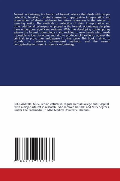 Forensic odontology is a branch of forensic science that deals with proper collection, handling, careful examination, appropriate interpretation and preservation of dental evidences for future references in the interest of ensuring justice. The methods of collection of data, interpretation and other additional techniques employed in the forensic odontology discipline have undergone significant revisions. With the developing contemporary science the forensic odontology is also molding to new trends which made it possible to identify victims and also to produce solid evidence against the criminals to prove their indulgence in crime scene. This book is aimed to provide a review in conventional methods, and the current conceptualizations used in forensic odontology.