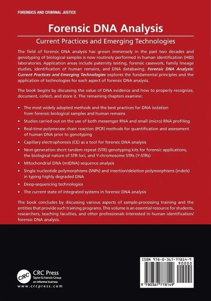 Sample Collection, Sample Storage, and DNA Extraction. Forensic DNA Evidence Collection at a Crime Scene: An Investigator's Commentary. Optimizing Storage and Handling of DNA Extracts. Extraction of DNA from Forensic Biological Samples for Genotyping. Extraction of DNA from Human Remains. Sample Assessment. RNA Profiling for the Identification of the Tissue Origin of Dried Stains in Forensic Biology. Assessment of DNA Extracted from Forensic Samples Prior to Genotyping. STRs-Proven Genotyping Markers. Principles, Practice, and Evolution of Capillary Electrophoresis as a Tool for Forensic DNA Analysis. Next-Generation STR Genotyping Kits for Forensic Applications. Biology and Genetics of New Autosomal STR Loci Useful for Forensic DNA Analysis. Hidden Variation in Microsatellite Loci: Utility and Implications for Forensic DNA. Additional Y-STRs in Forensics: Why, Which, and When. Expanding the Genotyping Capabilities. Forensic Mitochondrial DNA Analysis: Current Practice and Future Potential. Applications of Autosomal SNPs and Indels in Forensic Analysis. Deep-Sequencing Technologies and Potential Applications in Forensic DNA Testing. Sample-to-Result STR Genotyping Systems: Potential and Status. Training. Training of Forensic DNA Scientists-A Commentary. Index.