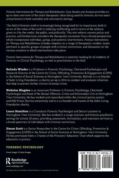 The field of forensic work is increasingly being recognised for its importance, both in terms of the value of the work in reducing reoffending and in terms of the salience given to it by the media, the public, and politically. This text reflects current policy and practice, and furthermore considers the therapeutic encounter from a broad perspective, which incorporates individual, group, and systemic interventions. Forensic Interventions for Therapy and Rehabilitation includes chapters on a range of therapeutic models, issues pertinent to specific groups of people with criminal convictions, and discussion on the various contexts in which interventions take place.