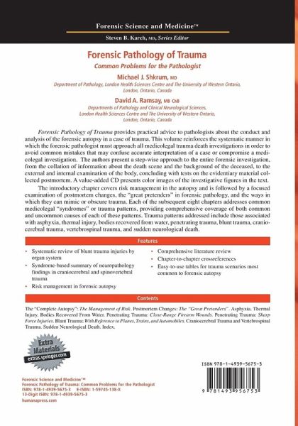The practice of forensic pathology includes the collection and analysis of evidence in relation to a corpse in order to establish the cause of death. Knowledge of the cause of death contributes to the determination of the manner of death by medical examiners and coroners, who are occasionally assisted by law enforcement officers. In the process of establishing the cause and manner of death, representatives of various investigative bodies have several responsibilities, including explaining the death to family members, attempting to reduce the risk of similar deaths in the future, and, if applicable, apprehending the individuals who are responsible for the death. The most well-known and popular role of a forensic pathologist is in the inves- gation of cases of suspicious death; however, most medicolegal autopsies involve unexpected deaths that are above suspicion, many of which are caused by trauma (trauma being defined as any physical force or agent that causes bodily harm). The purposeof Forensic Pathology of Trauma: Common Problems for the Pathologist is to provide practical advice and information about the conduct of the forensic autopsy in cases of trauma, and to offer guidance about the analysis of the autopsy findings in these cases.