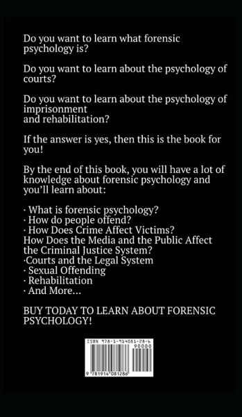 Do you want to learn what forensic psychology is? Do you want to learn about the psychology of courts? Do you want to learn about the psychology of imprisonment and rehabilitation? If the answer is yes, then this is the book for you! By the end of this book, you will have a lot of knowledge about forensic psychology and you'll learn about: · What is forensic psychology? · How do people offend? · How Does Crime Affect Victims? · How Does the Media and the Public Affect the Criminal Justice System? · Courts and the Legal System · Sexual Offending · Rehabilitation · And More... BUY TODAY TO LEARN ABOUT FORENSIC PSYCHOLOGY! Forensic Psychology Content: Introduction: What is Forensic Psychology Chapter 1: Development of Offending: Theories and Perspectives Part 1: Public and Crime Chapter 2: Victims and Crime Chapter 3: Theories of The Fear of Crime Chapter 4: Victimology, Restorative Justice and PTSD Chapter 5: Why Do We Listen to the Public? Part 2: Courts and the Legal System Chapter 6: Courts and the Legal System Chapter 7: Types of Courts and the Youth Justice System Chapter 8: The Courtroom, Witnesses and Lawyers Chapter 9: Juries and Problems with Juries Part 3: Sex Offending Chapter 10: Sexual Offending Chapter 11: Theories of Sexual Offending Part 4: Rehabilitation Chapter 12: Rehabilitation Chapter 13: Problems and Challenges for Treatment Chapter 14: Treating Violent Offenders Chapter 15: Recovery Capital and Mindset Chapter 16: Rehabilitation Theories and Models Chapter 17: Does Treatment Work? Part 5: Imprisonment Chapter 18: History, Imprisonment Principles and Public Opinion Chapter 19: Effects of Imprisonment Chapter 20: Approaches to Punishment Chapter 21: Violence in Prison Chapter 22: Suicide and Self-Harm in Prison Chapter 23: Mental Illness and Crime