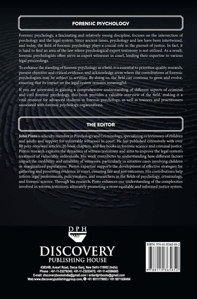 Forensic psychology, a fascinating and relatively young discipline, focuses on the intersection of psychology and the legal system. Since ancient times, psychology and law have been intertwined, and today, the field of forensic psychology plays a crucial role in the pursuit of justice. In fact, it is hard to find an area of the law where psychological expert testimony is not utilized. As a result, forensic psychologists often serve as expert witnesses in court, lending their expertise to various legal proceedings.To enhance the standing of forensic psychology as a field, it is essential to prioritize quality research, present objective and critical evidence, and acknowledge areas where the contributions of forensic psychologists may be subject to scrutiny. By doing so, the field can continue to grow and evolve, ensuring that its impact on the legal system remains meaningful.If you are interested in gaining a comprehensive understanding of different aspects of criminal and civil forensic psychology, this book provides a valuable overview of the field, making it a vital resource for advanced students in forensic psychology, as well as trainees and practitioners associated with forensic psychology organizations.