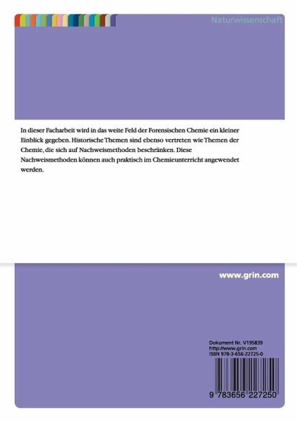 Facharbeit (Schule) aus dem Jahr 2012 im Fachbereich Chemie - Analytische Chemie, Note: 1+, , Sprache: Deutsch, Abstract: In dieser Facharbeit wird in das weite Feld der Forensischen Chemie ein kleiner Einblick gegeben. Historische Themen sind ebenso vertreten wie Themen der Chemie, die sich auf Nachweismethoden beschränken. Diese Nachweismethoden können auch praktisch im Chemieunterricht angewendet werden.